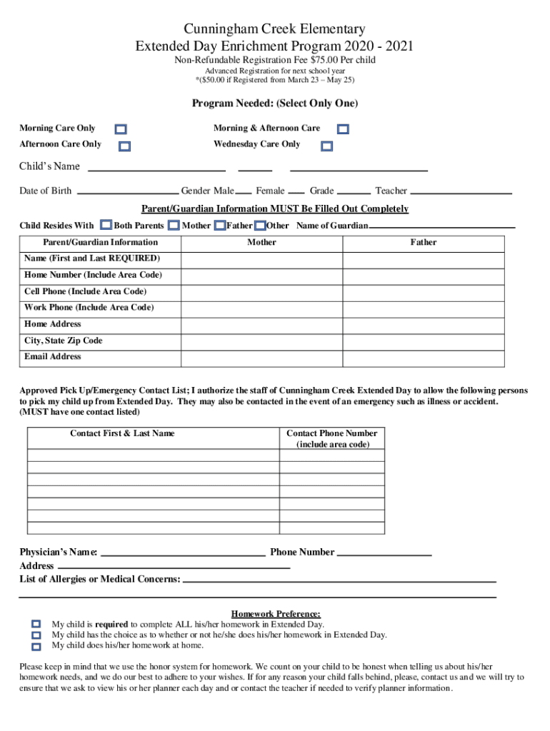 Cunningham Creek Elementary Extended Day Enrichment Program 2020 2021 NonRefundable Registration Fee $75.00 Per child Advanced Registration for next school year *($50.00 if Registered from March 23