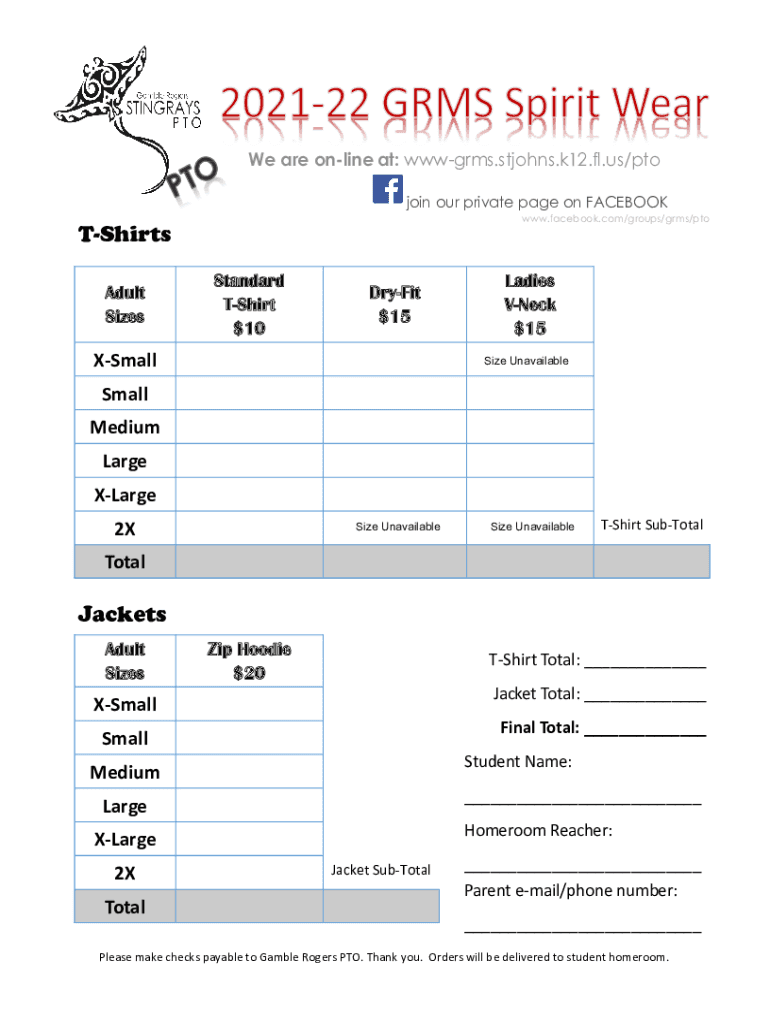 We are online at: worms.stjohns.k12.fl.us/pto join our private page on FACEBOOK www.facebook.com/groups/grms/ptoTShirts Adult SizesStandard Shirt $10DryFit $15XSmallLadies Neck $15 Size Unavailable