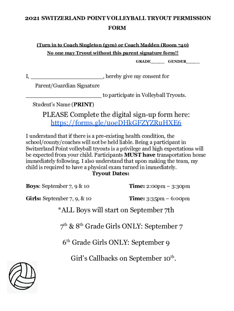 2021 SWITZERLAND POINT VOLLEYBALL TRYOUT PERMISSION FORM (Turn in to Coach Singleton (gym) or Coach Madden (Room 740) No one may Try out without this parent signature form!! GRADE GENDER I, hereby