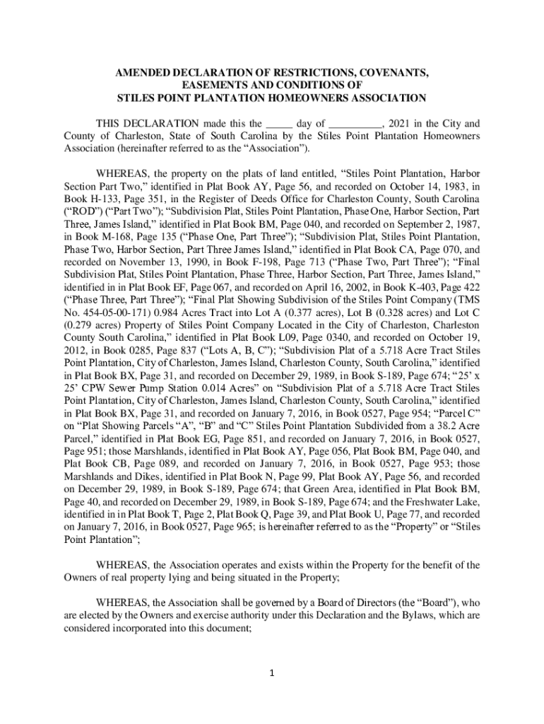 AMENDED DECLARATION OF RESTRICTIONS, COVENANTS, EASEMENTS AND CONDITIONS OF STILES POINT PLANTATION HOMEOWNERS ASSOCIATION THIS DECLARATION made this the day of, 2021 in the City and County of Charleston,
