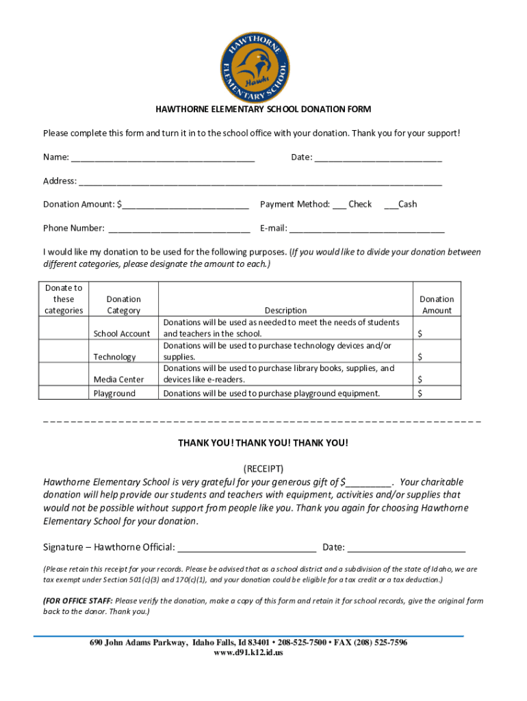 Parents, guardians, and other members of the school community are typically required to file Hawthorne Elementary School donation forms if they have made a donation.