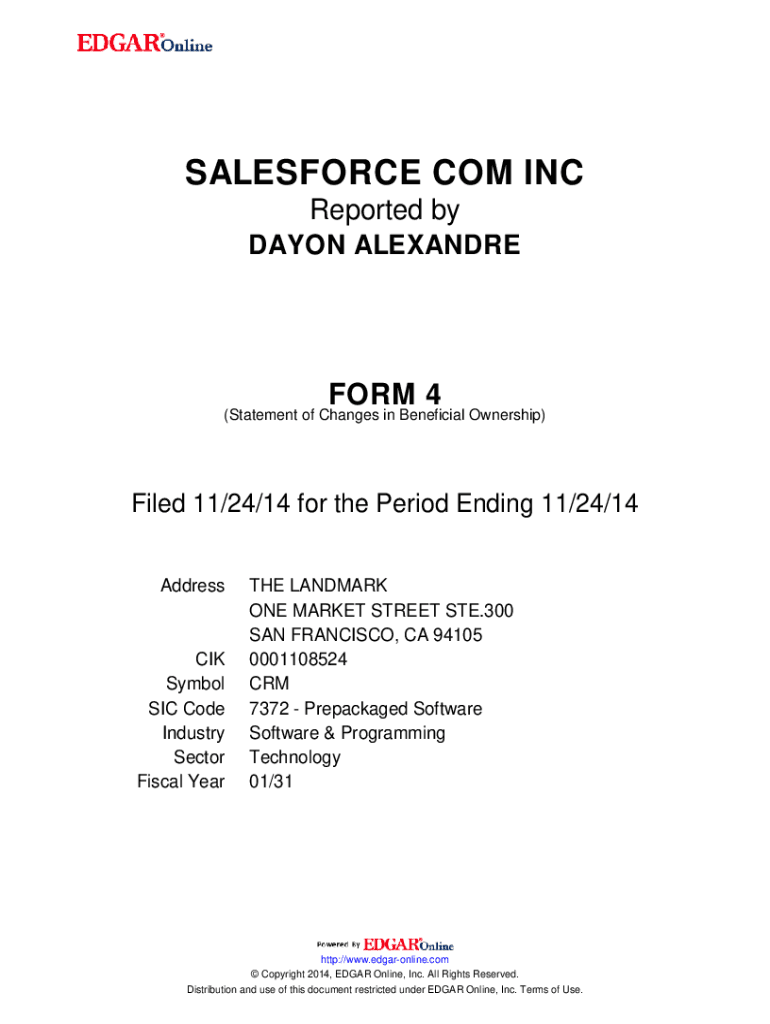 SALESFORCE COM INC Reported by DAMON ALEXANDREFORM 4(Statement of Changes in Beneficial Ownership)Filed 11/24/14 for the Period Ending 11/24/14 Address CIK Symbol SIC Code Industry Sector Fiscal Earth