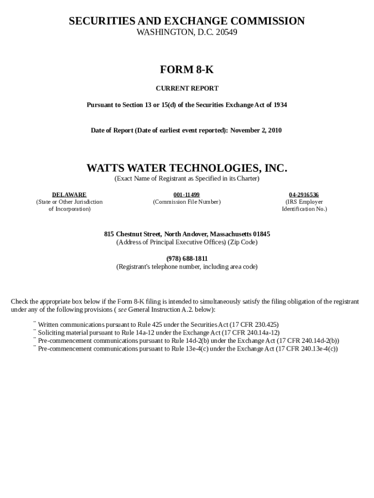 Frequently asked questions about On November 2, 2010, Watts Water Technologies, Inc template