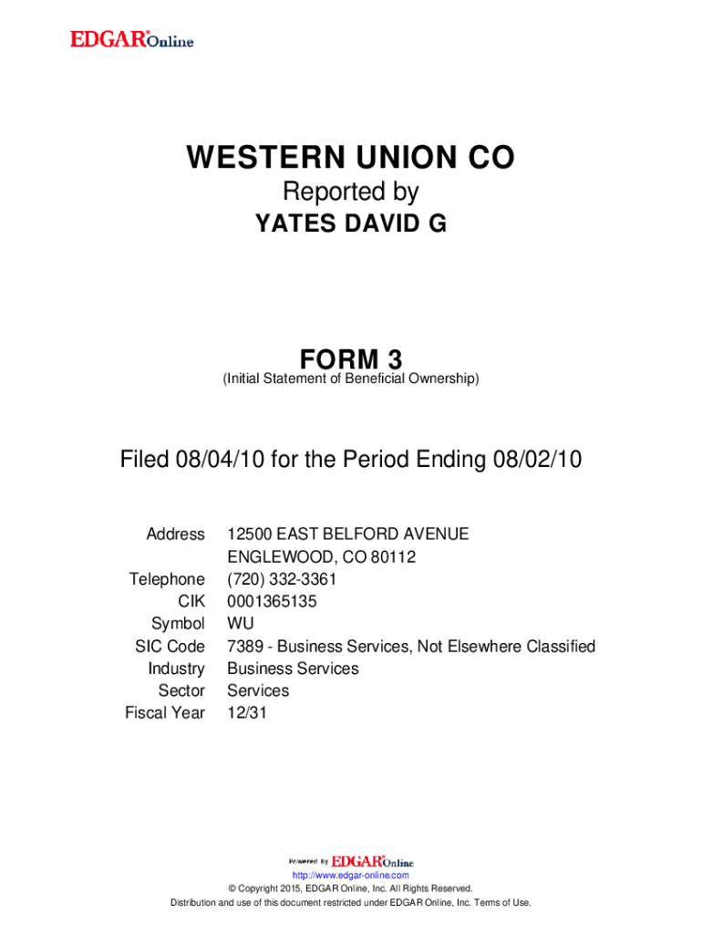 Get the free WESTERN UNION CO. FORM 3 (Initial Statement of Beneficial Ownership) Filed 08/04/10 ...