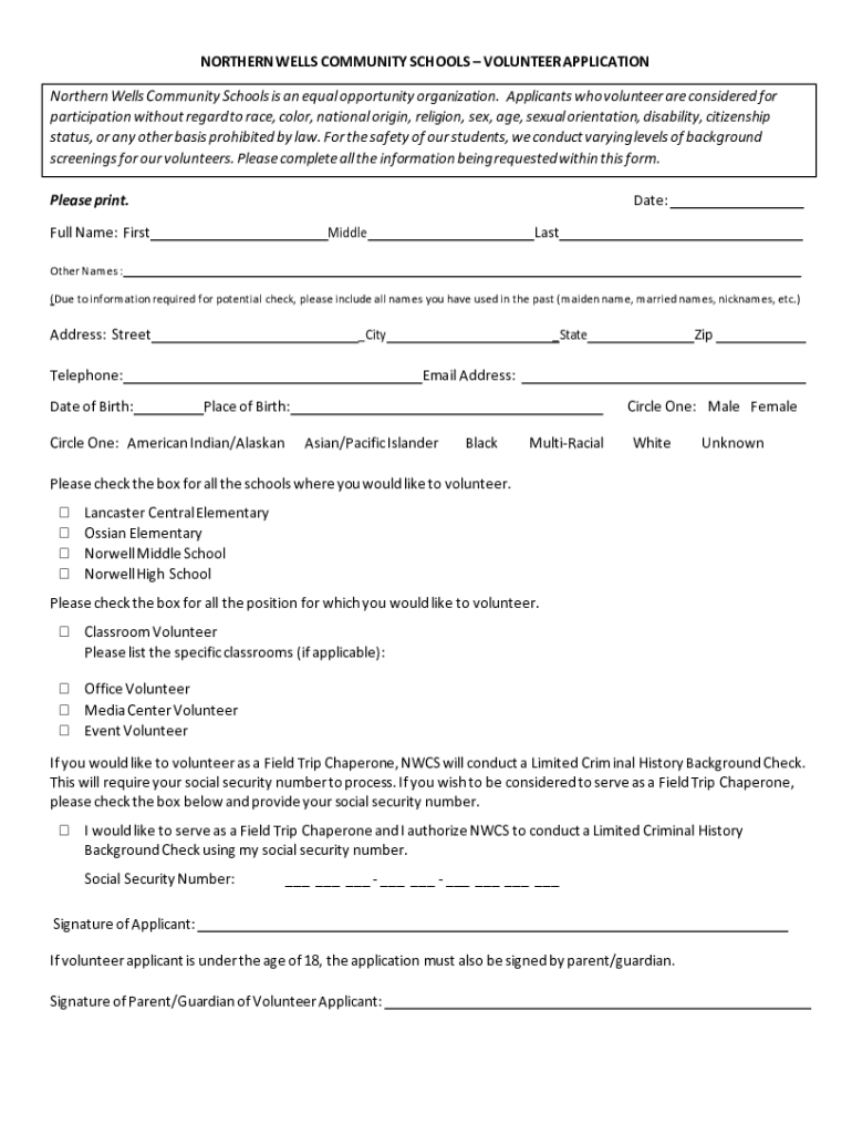 NORTHERN WELLS COMMUNITY SCHOOLS VOLUNTEER APPLICATION Northern Wells Community Schools is an equal opportunity organization. Applicants who volunteer are considered for participation without regard