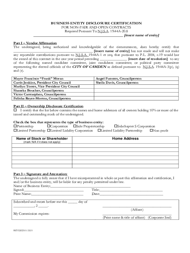 BUSINESS ENTITY DISCLOSURE CERTIFICATION FOR UNFAIR AND OPEN CONTRACTS Required Pursuant To N.J.S.A. 19:44A20.8 insert name of entity Part I Vendor Affirmation The undersigned, being authorized and