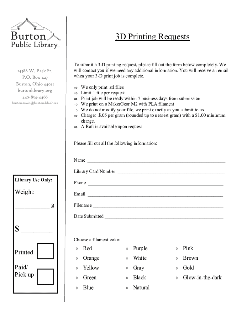 3D Printing Requests14588 W. Park St. P.O. Box 427 Burton, Ohio 44021 burtonlibrary.org 4408344466 burton.main@burton.lib.oh.usTo submit a 3D printing request, please fill out the form below completely.