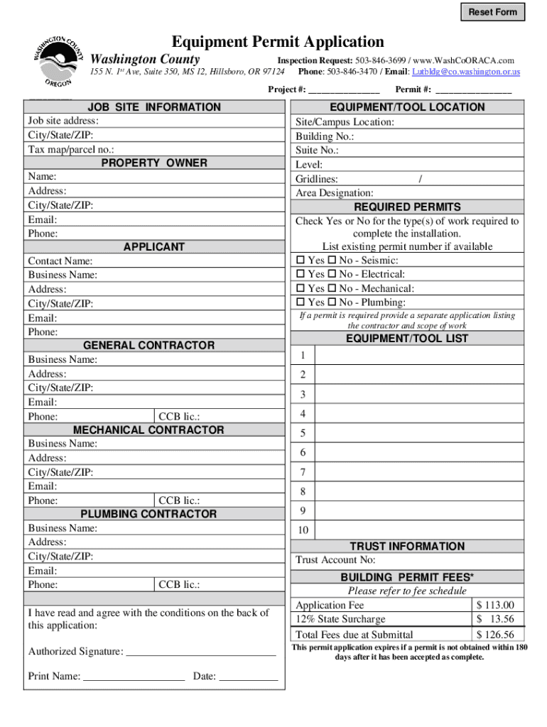Pointiest FormEquipment Permit Application Washington County Inspection Request: 5038463699 / www.WashCoORACA.com 155 N. 1st Ave, Suite 350, MS 12, Hillsboro, OR 97124 Phone: 5038463470 / Email: Outbid