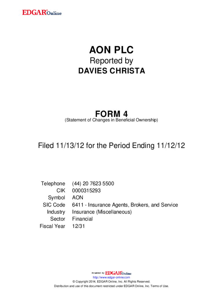 Get the free AON PLC. FORM 4 (Statement of Changes in Beneficial Ownership) Filed 11/13/12 for th...