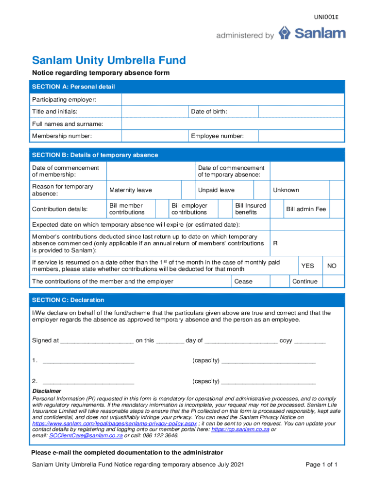 UNI001ESanlam Unity Umbrella Fund Notice regarding temporary absence form SECTION A: Personal detail Participating employer: Title and initials:Date of birth:Full names and surname: Membership number:Employee