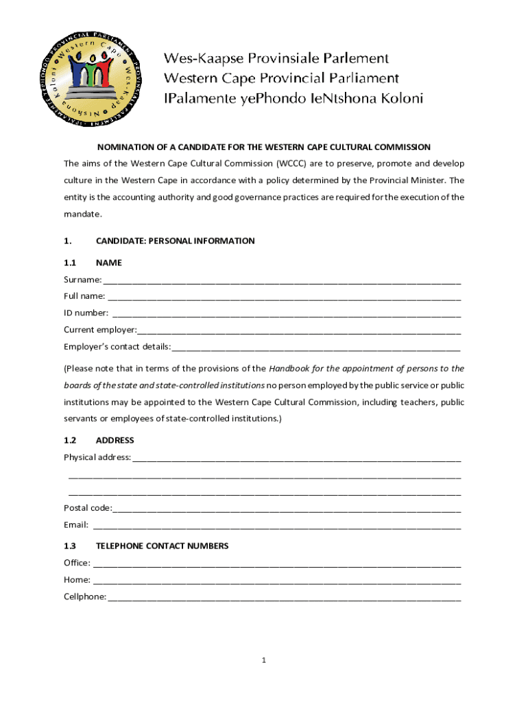 Get the free NOMINATION OF A CANDIDATE FOR THE WESTERN CAPE CULTURAL ...