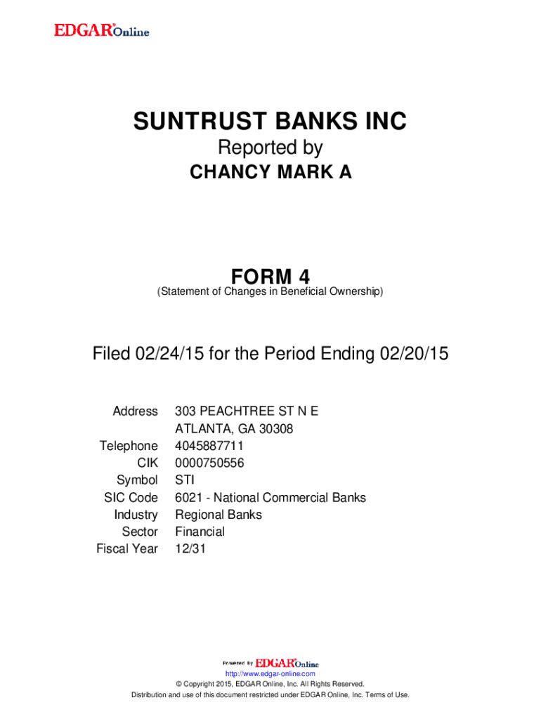 Get the free SUNTRUST BANKS INC. FORM 4 (Statement of Changes in Beneficial Ownership) Filed 02/2...