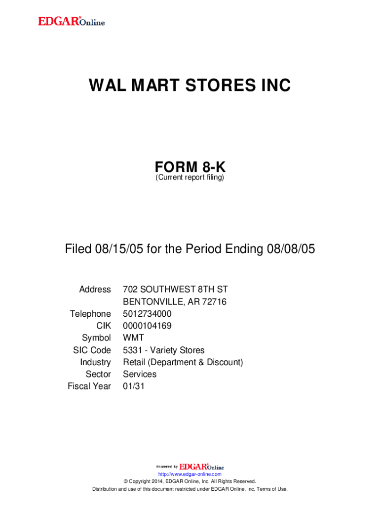 WAS MART STORES INFORM 8K (Current report filing)Filed 08/15/05 for the Period Ending 08/08/05 Address Telephone CIK Symbol SIC Code Industry Sector Fiscal Year702 SOUTHWEST 8TH ST BENTONVILLE, AR