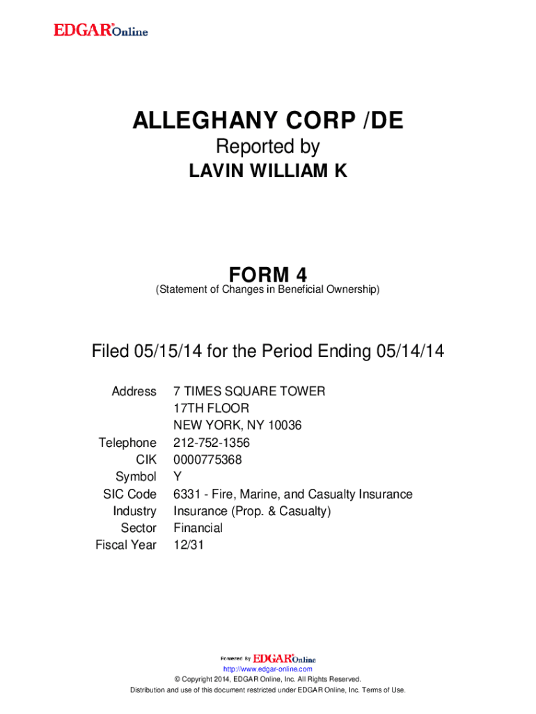 ALLEGHENY CORP /DE Reported by LATIN WILLIAM FORM 4(Statement of Changes in Beneficial Ownership)Filed 05/15/14 for the Period Ending 05/14/14 AddressTelephone CIK Symbol SIC Code Industry Sector