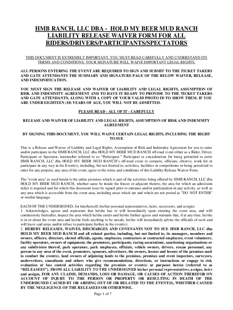 HM BRANCH, LLC DBA HOLD MY BEER MUD RANCH LIABILITY RELEASE WAIVER FORM FOR ALL RIDERS/DRIVERS/PARTICIPANTS/SPECTATORS THIS DOCUMENT IS EXTREMELY IMPORTANT. YOU MUST READ CAREFULLY AND UNDERSTAND