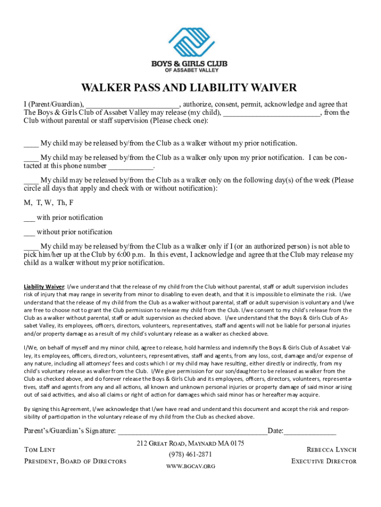 WALKER PASS AND LIABILITY WAIVER I (Parent/Guardian), authorize, consent, permit, acknowledge and agree that The Boys & Girls Club of Ass abet Valley may release (my child), from the Club without