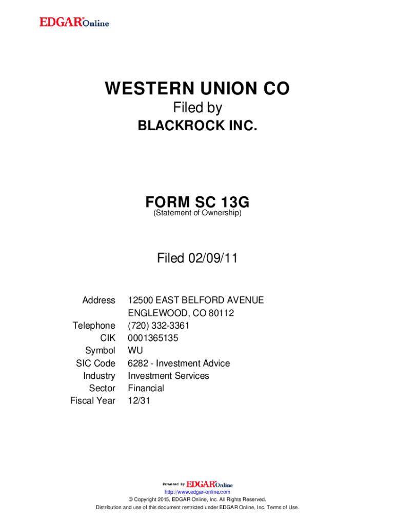 WESTERN UNION CO Filed by BlackRock INC.FORM SC 13G (Statement of Ownership) Filed 02/09/11 Address Telephone CIK Symbol SIC Code Industry Sector Fiscal Year12500 EAST BEDFORD AVENUE ENGLEWOOD, CO