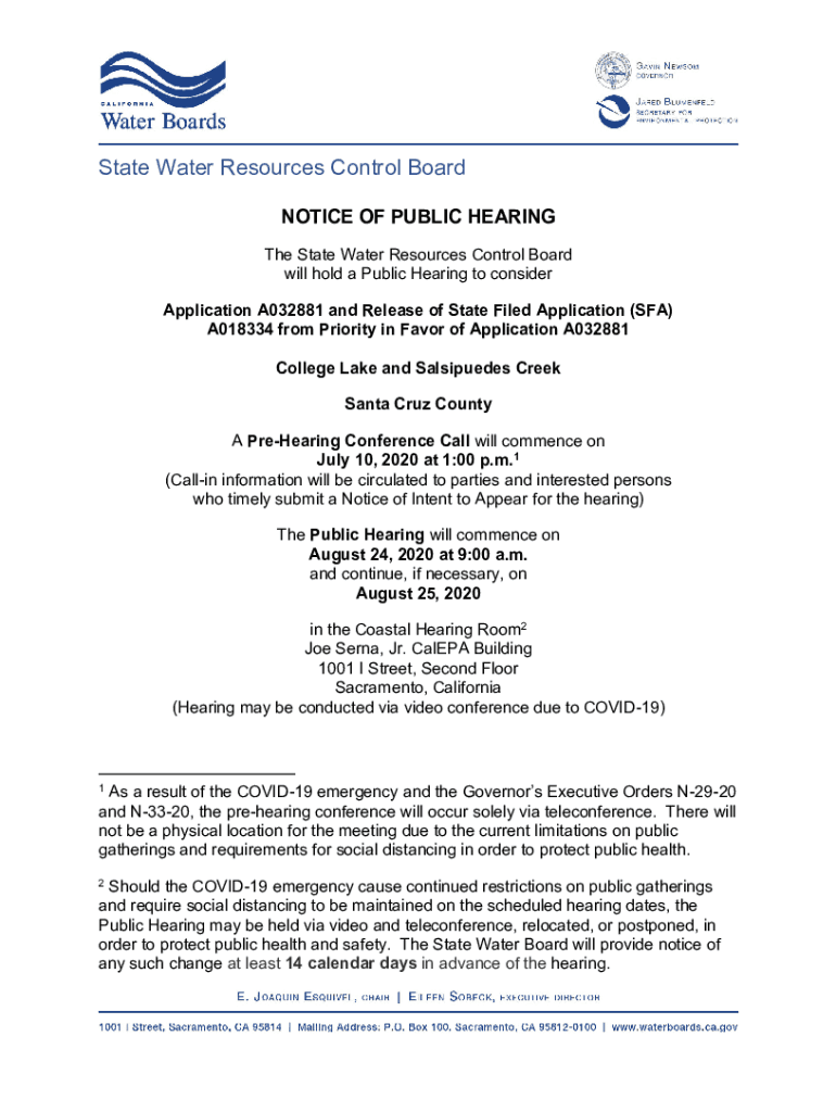 State Water Resources Control Board NOTICE OF PUBLIC HEARING The State Water Resources Control Board will hold a Public Hearing to consider Application A032881 and Release of State Filed Application
