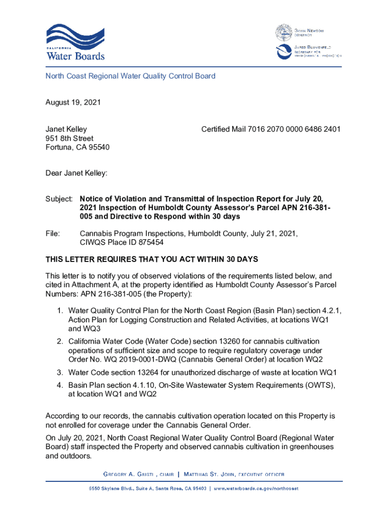 North Coast Regional Water Quality Control Board August 19, 2021Janet Kelley 951 8th Street Fortuna, CA 95540Certified Mail 7016 2070 0000 6486 2401Dear Janet Kelley: Subject: Notice of Violation