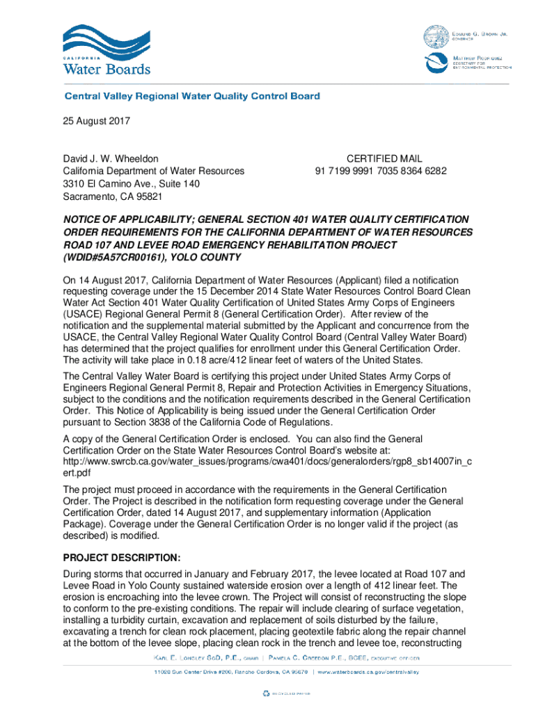 25 August 2017David J. W. Wheel don California Department of Water Resources 3310 El Camino Ave., Suite 140 Sacramento, CA 95821CERTIFIED MAIL 91 7199 9991 7035 8364 6282NOTICE OF APPLICABILITY; GENERAL