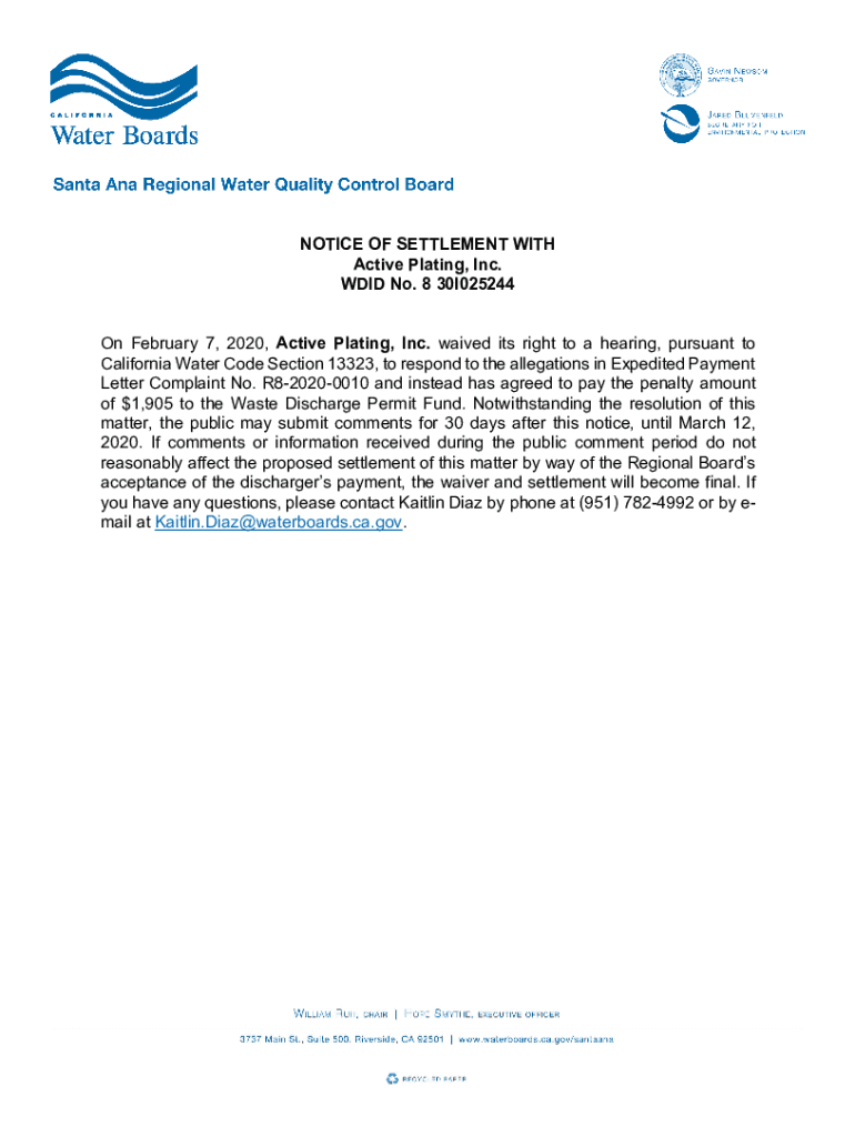 NOTICE OF SETTLEMENT WITH Active Plating, Inc. DID No. 8 30I025244 On February 7, 2020, Active Plating, Inc. waived its right to a hearing, pursuant to California Water Code Section 13323, to respond