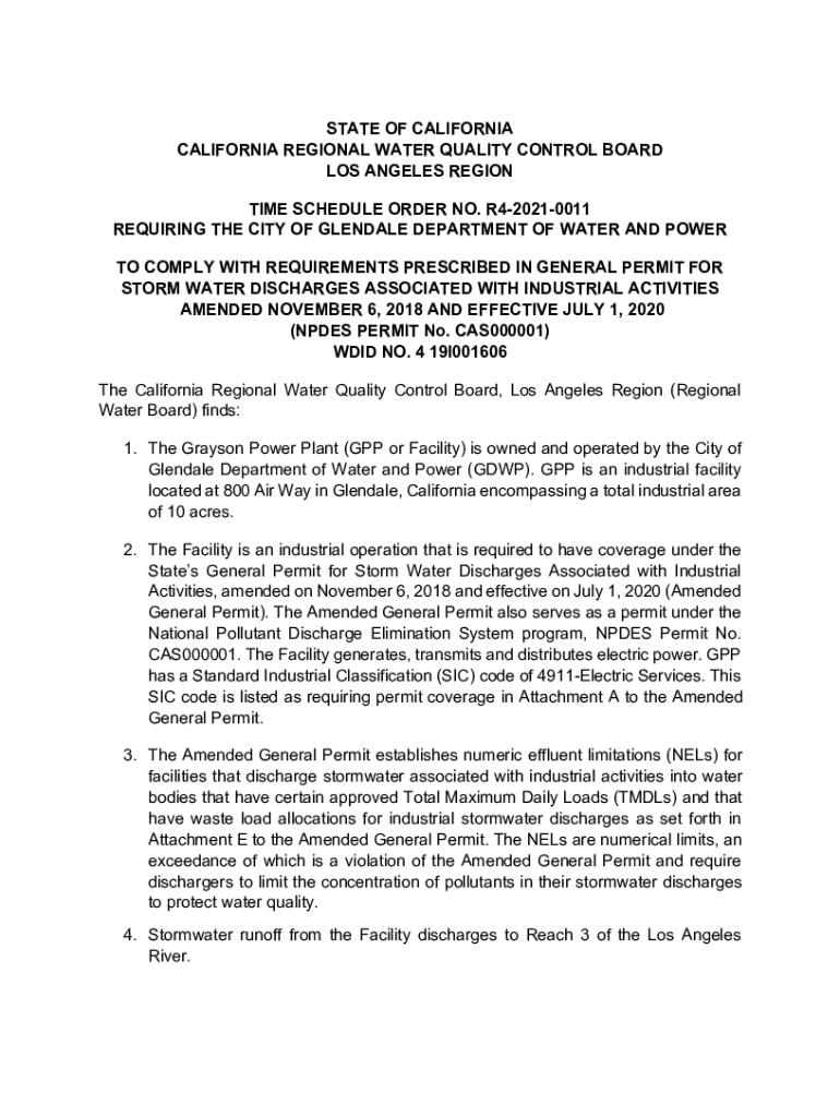 STATE OF CALIFORNIA REGIONAL WATER QUALITY CONTROL BOARD LOS ANGELES REGION TIME SCHEDULE ORDER NO. R420210011 REQUIRING THE CITY OF GLENDALE DEPARTMENT OF WATER AND POWER TO COMPLY WITH REQUIREMENTS