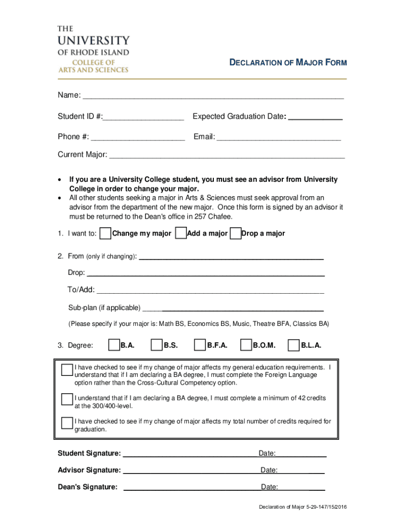 DECLARATION OF MAJOR Forename: Student ID #: Expected Graduation Date: Phone #: Email: Current Major: If you are a University College student, you must see an advisor from University College in order