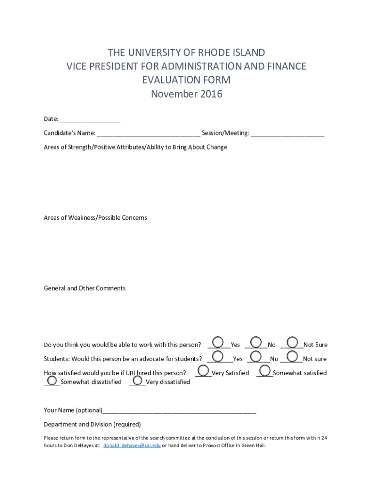THE UNIVERSITY OF RHODE ISLAND VICE PRESIDENT FOR ADMINISTRATION AND FINANCE EVALUATION FORM November 2016 Date: Candidates Name: Session/Meeting: Areas of Strength/Positive Attributes/Ability to