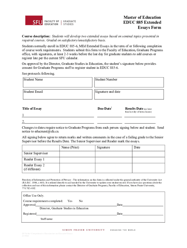 Get the free EDUC 885 Extended Essay Form.pdf - Simon Fraser University