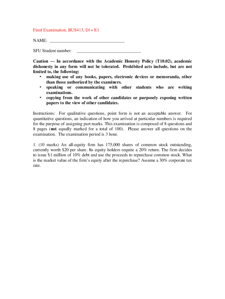 Final Examination, BUS413, D1+ E1 NAME: SFU Student number: Caution In accordance with the Academic Honesty Policy (T10.02), academic dishonesty in any form will not be tolerated. Prohibited acts