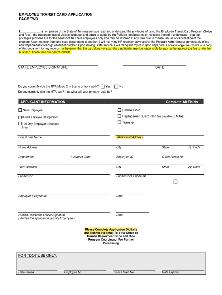 State of TennesseeEmployee Transit Card ApplicationThank you for participating in the State Employee Transit Card Program that will contribute to air quality improvements and reduce congestion in