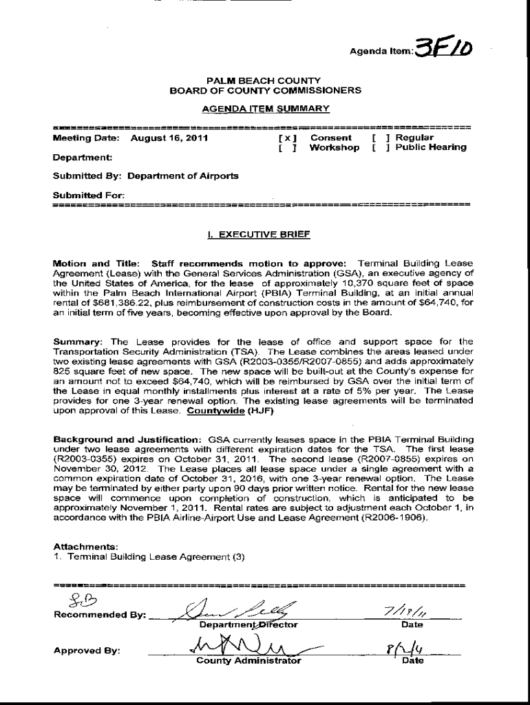 Agendaless:30tJPALM BEACH COUNTY BOARD OF COUNTY COMMISSIONERS AGENDA ITEM SUMMARYMeeting Date: x August 16, 2011Consent Workshop Regular Public HearingDepartment: Submitted By: Department of Airports