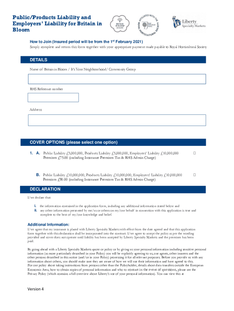 Public/Products Liability and Employers Liability for Britain in Bloom How to Join (Insured period will be from the 1st February 2021) Simply complete and return this form together with your appropriate