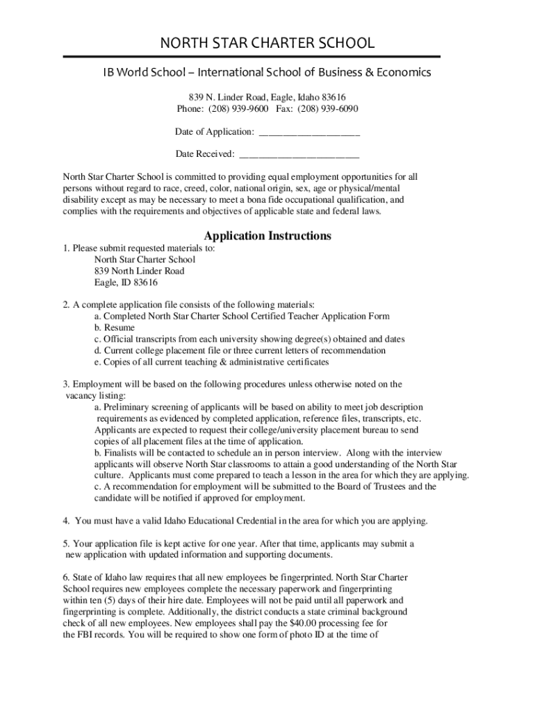 NORTH STAR CHARTER SCHOOL IB World School International School of Business & Economics 839 N. Liner Road, Eagle, Idaho 83616 Phone: (208) 9399600 Fax: (208) 9396090 Date of Application: Date Received: