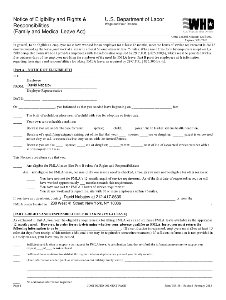 Notice of Eligibility and Rights & Responsibilities(Family and Medical Leave Act)U.S. Department of Labor Wage and Hour Division OMB Control Number: 12350003 Expires: 5/31/2018 In general, to be eligible