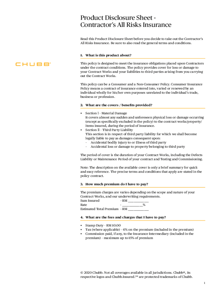 Product Disclosure Sheet Contractors All Risks Insurance Read this Product Disclosure Sheet before you decide to take out the Contractors All Risks Insurance. Be sure to also read the general terms