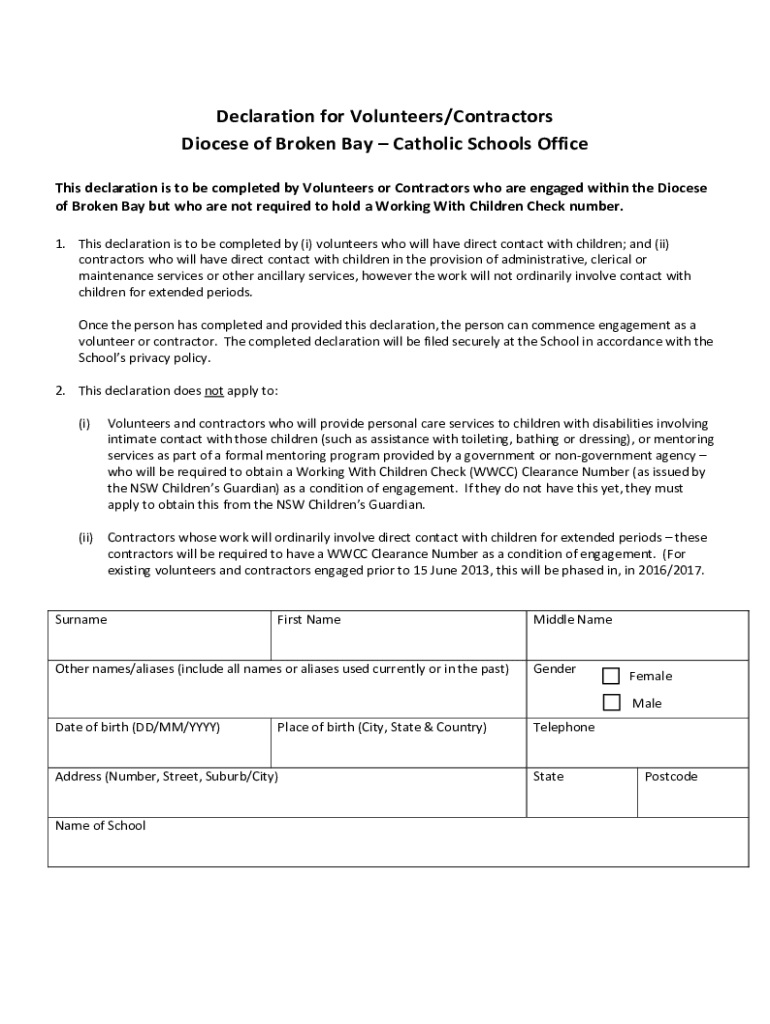 Declaration for Volunteers/Contractors Diocese of Broken Bay Catholic Schools Office This declaration is to be completed by Volunteers or Contractors who are engaged within the Diocese of Broken Bay