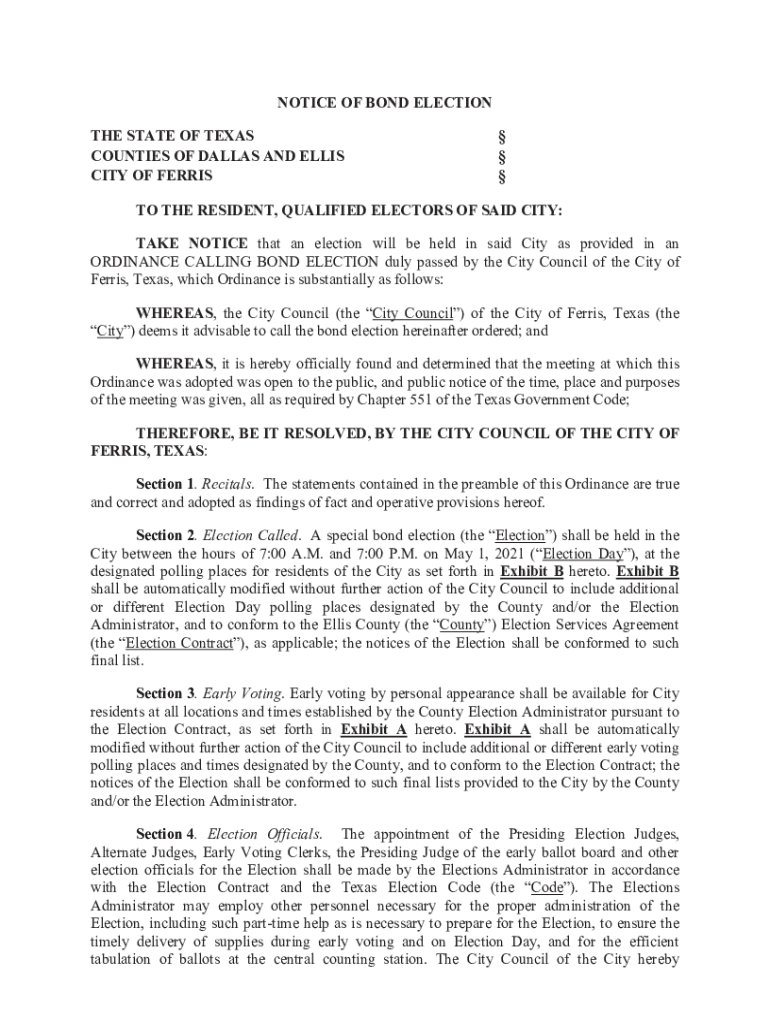 NOTICE OF BOND ELECTION THE STATE OF TEXAS COUNTIES OF DALLAS AND ELLIS CITY OF FERRIS TO THE RESIDENT, QUALIFIED ELECTORS OF SAID CITY: TAKE NOTICE that an election will be held in said City as provided