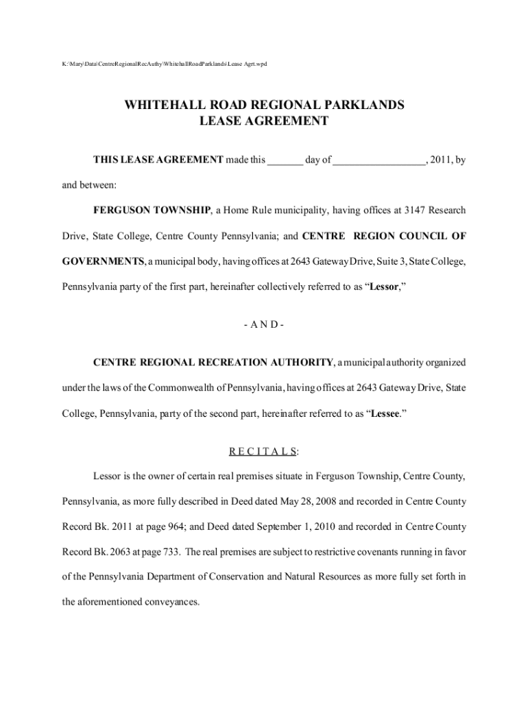 K:MaryDataCentreRegionalRecAuthyWhitehallRoadParklandsLease Art. Whitehall ROAD REGIONAL PARKLAND LEASE AGREEMENT THIS LEASE AGREEMENT made this day of, 2011, by and between: FERGUSON TOWNSHIP, a