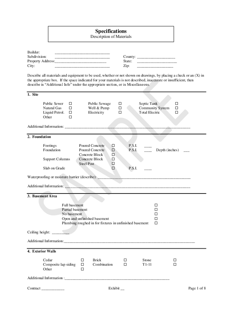 Specifications Description of MaterialsBuilder: Subdivision: Property Address: City: County: State: Zip: Describe all materials and equipment to be used, whether shown on drawings, by placing a check