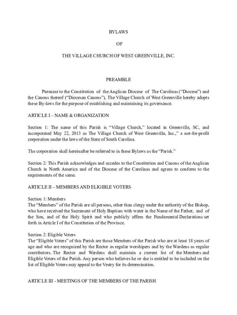 BYLAWS OF THE VILLAGE CHURCH OF WEST GREENVILLE, INC.PREAMBLE Pursuant to the Constitution of the Anglican Diocese of The Carolina's (Diocese) and the Canons thereof (Diocesan Canons), The Village