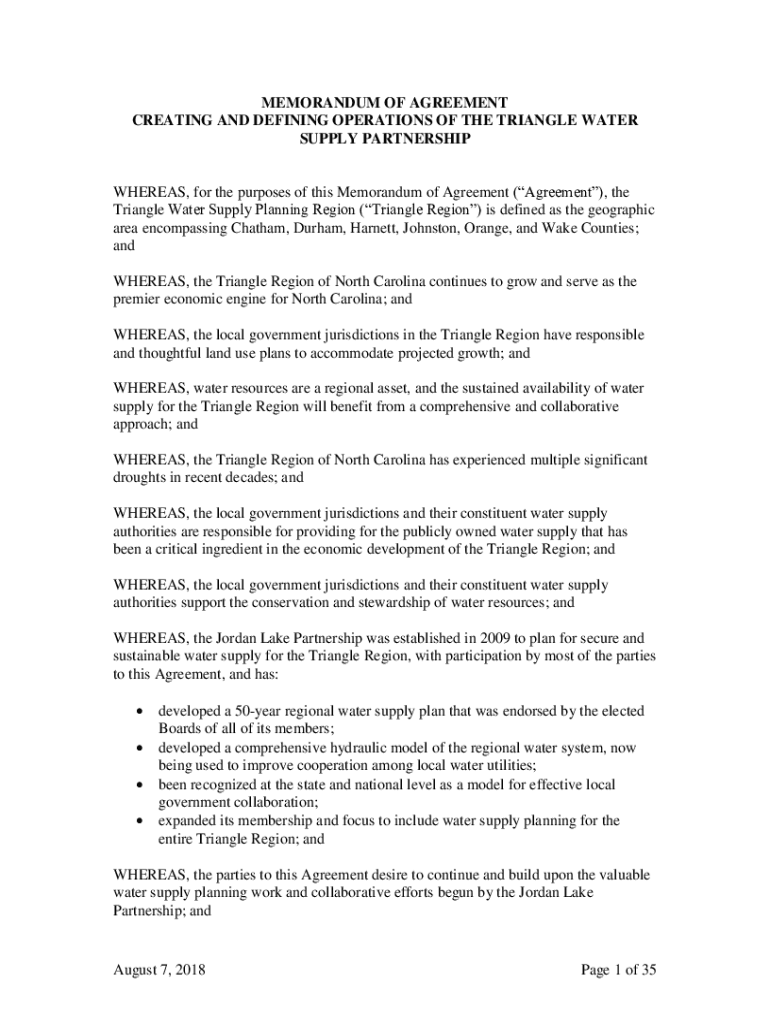 MEMORANDUM OF AGREEMENT CREATING AND DEFINING OPERATIONS OF THE TRIANGLE WATER SUPPLY PARTNERSHIP WHEREAS, for the purposes of this Memorandum of Agreement (Agreement), the Triangle Water Supply Planning