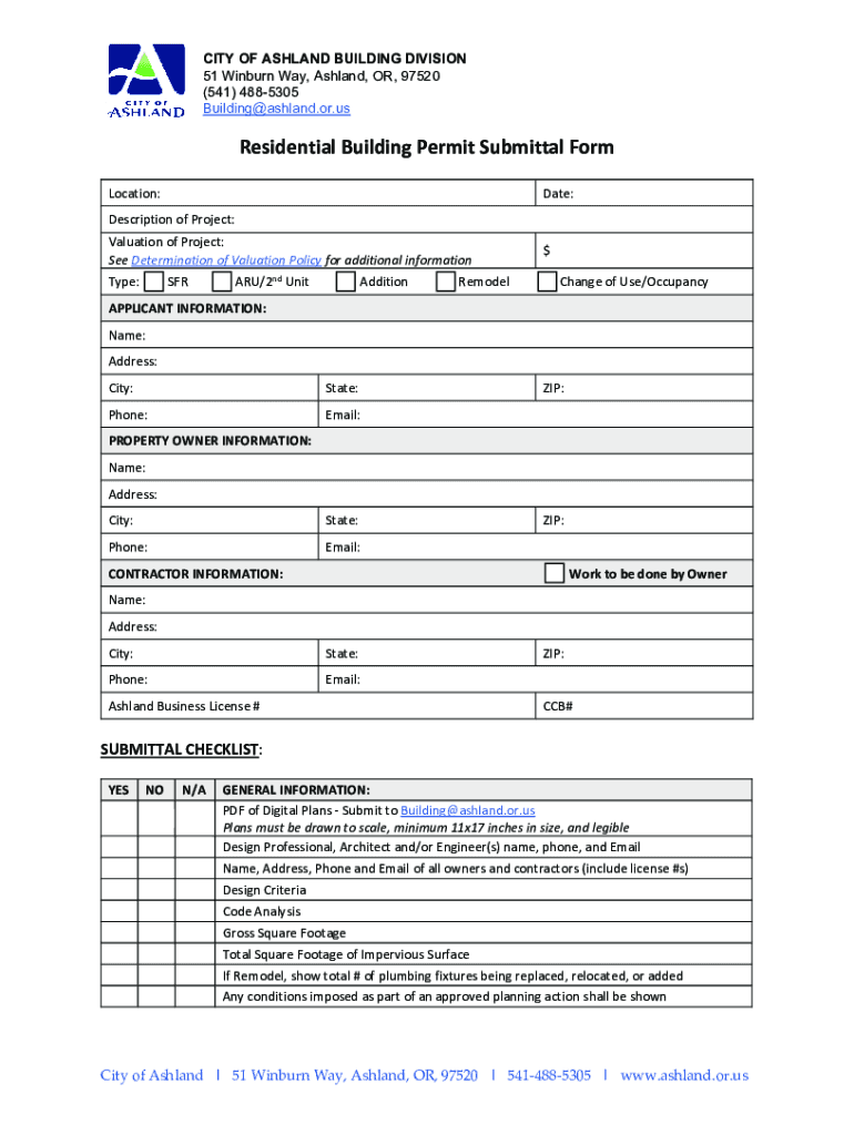 CITY OF ASHLAND BUILDING DIVISION 51 Wilburn Way, Ashland, OR, 97520 (541) 4885305 Building@ashland.or.usResidentialBuildingPermitSubmittalForm Location:Date:DescriptionofProject: ValuationofProject: