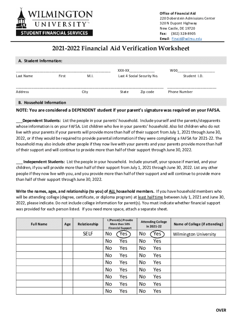 Office of Financial Aid 220 Bernstein Admissions Center 320 N Dupont Highway New Castle, DE 19720 Fax: (302) 3288905 Email: Fin aid Wilma.edu20212022 Financial Aid Verification Worksheet A. Student