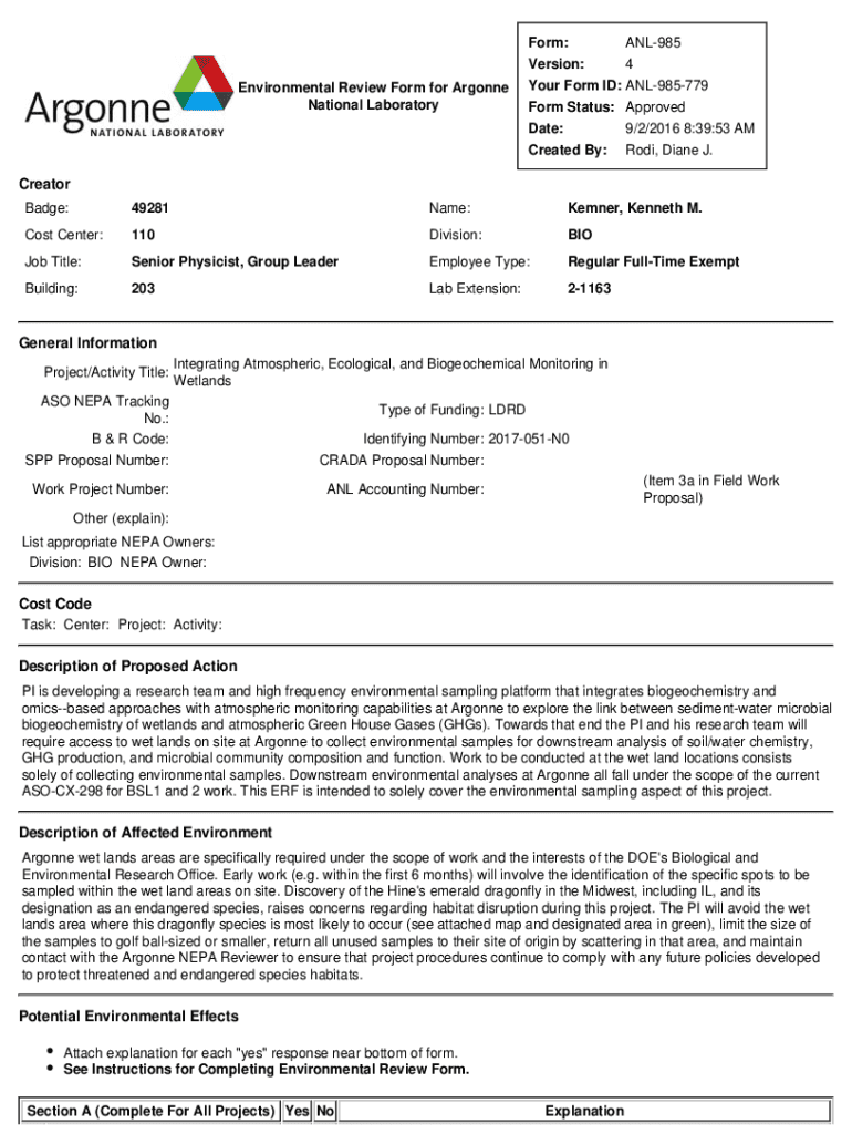 Environmental Review Form for Argonne National LaboratoryForm: Version: Your Form ID: Form Status: Date: Created By:ANL985 4 ANL985779 Approved 9/2/2016 8:39:53 AM Rod, Diane J. Creator Badge:49281Name:Keener,