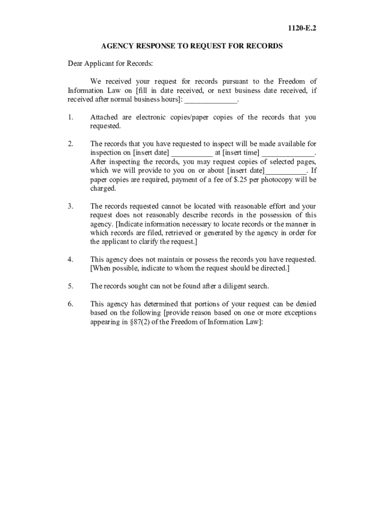 1120E.2 AGENCY RESPONSE TO REQUEST FOR RECORDS Dear Applicant for Records: We received your request for records pursuant to the Freedom of Information Law on fill in date received, or next business