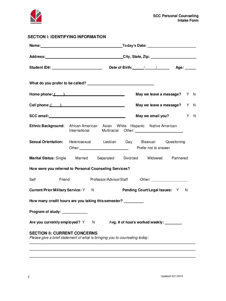 SCC Personal Counseling Intake Formation I: IDENTIFYING INFORMATION Name:Today's Date:Address:City, State, Zip:Student ID#:Date of Birth://Age:What do you prefer to be called? Home phone: (Cell phone: