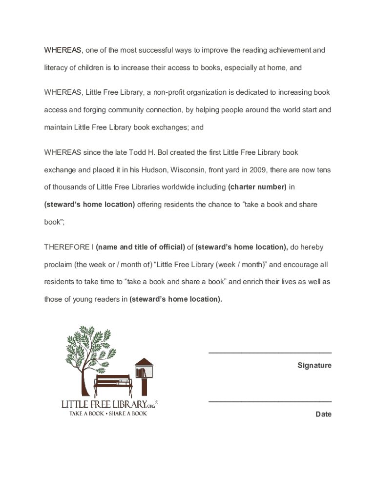 WHEREAS, one of the most successful ways to improve the reading achievement and literacy of children is to increase their access to books, especially at home, and WHEREAS, Little Free Library, a nonprofit