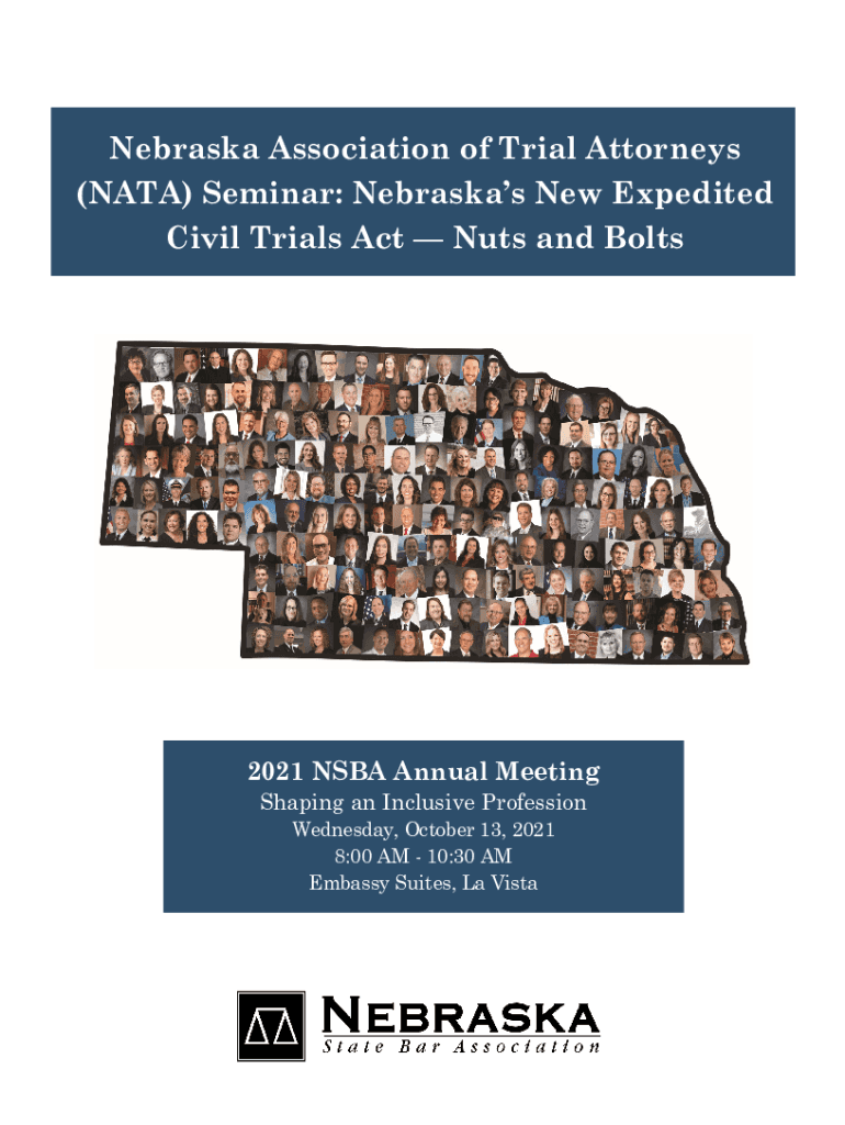 Nebraska Association of Trial Attorneys (DATA) Seminar: Nebraska's New Expedited Civil Trials Act Nuts and Bolts2021 NSA Annual Meeting Shaping an Inclusive Profession Wednesday, October 13, 2021