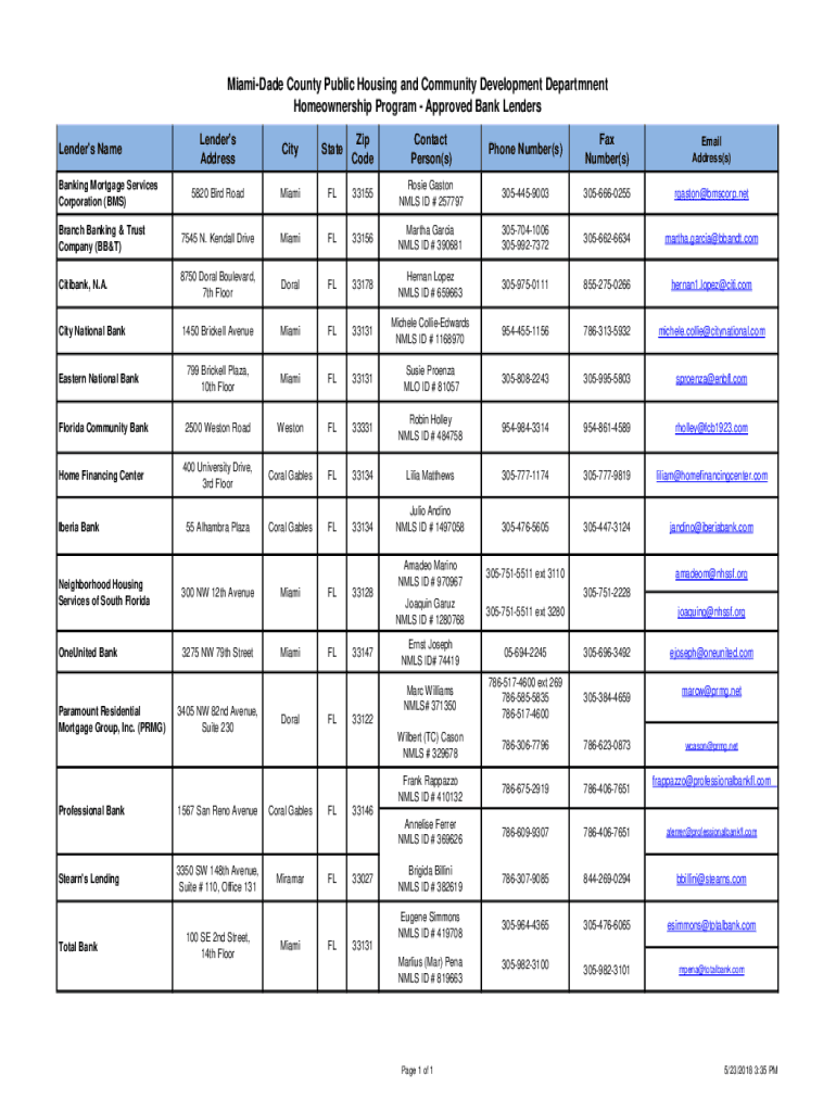 Miami-Dade County Public Housing and Community Development Department Homeownership Program Approved Bank Lenders Lender's AddressCityStateZip Recontact Person(s)Phone Number(s)Fax Number(s)Email
